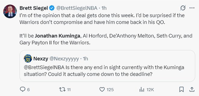 NBA记者Brett Siegel表示:我认为勇士与库明加的签约本周能达成。但勇士队如果不做出让步,让库明加以有球队选项的合同续约我会感到惊讶。