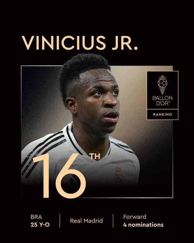 维尼修斯在今年金球奖评选中位列第16,较去年比暴跌14位